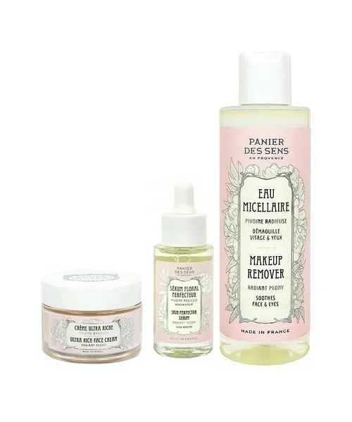 The set contains: Panier Des Sens Radiant Peony, 200 ml + Panier des Sens Radiant Peony Skin Perfector Serum, 30 ml + Des Sens Radiant Peony Ultra Rich Face Cream, 50 ml